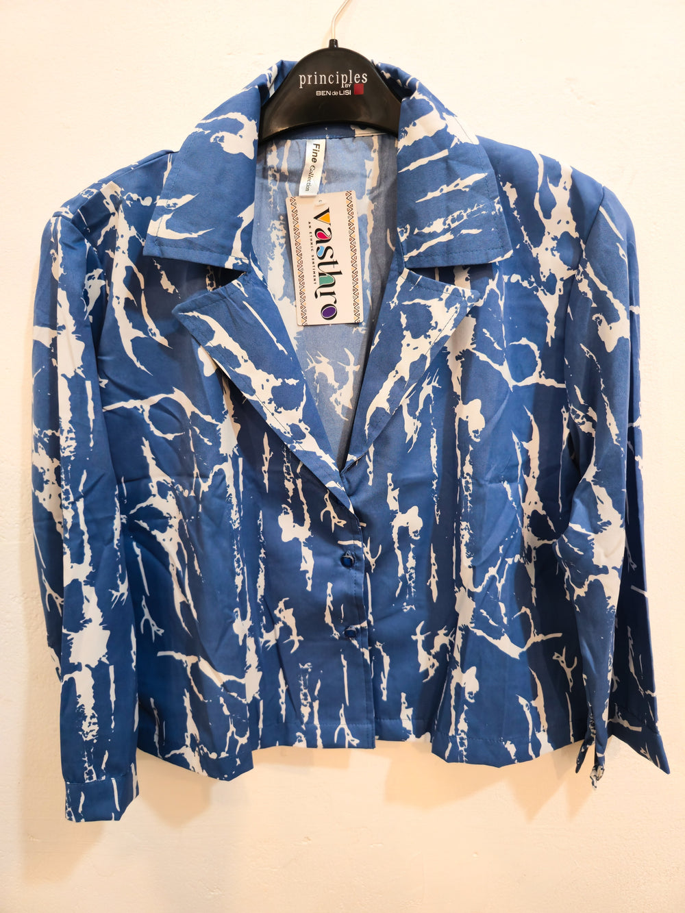 Make a bold statement with this eye-catching button-down shirt from Vastro. Featuring an abstract white-on-blue print, this shirt adds a splash of artistic flair to your wardrobe. The tailored fit, classic lapel collar, and structured cuffs bring a polished, contemporary look that pairs effortlessly with jeans, trousers, or skirts. Crafted from fine-quality fabric for breathable comfort and a flattering silhouette.