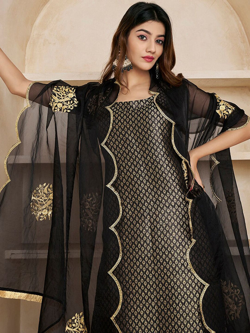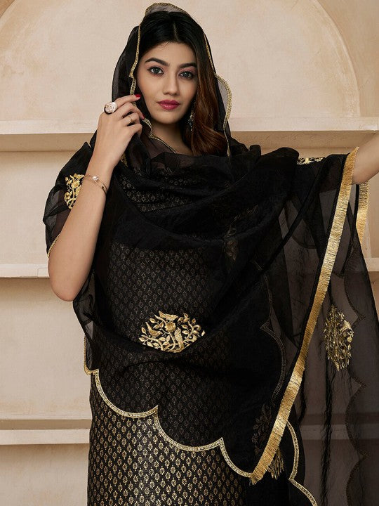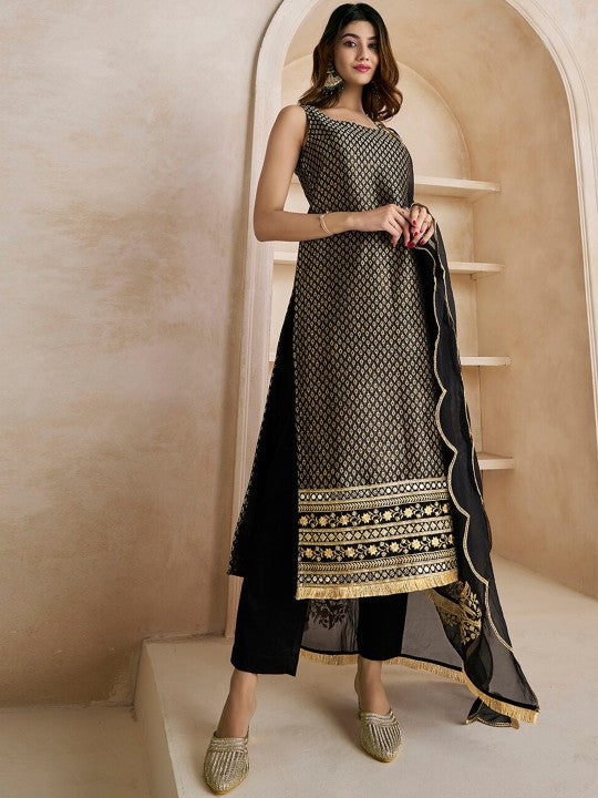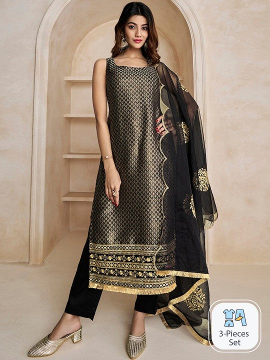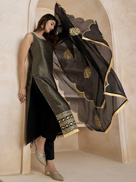The "Black Woven Design Thread Work & Zari Straight Kurta & Trousers with Dupatta" is a perfect blend of traditional charm and contemporary style. This outfit features a sophisticated woven design, complemented by intricate thread work and zari detailing, making it ideal for festive occasions. The straight kurta is designed in a regular style with a round neckline and sleeveless pattern, offering a modern yet elegant silhouette. The kurta boasts a calf-length straight hem crafted from a silk blend fabric in a brocade weave, ensuring a rich and luxurious appearance. Paired with comfortable cotton trousers featuring a partially elasticated waistband, this ensemble combines style with ease of wear. The set is completed with a lightweight organza dupatta, adding a touch of grace and flowy elegance. Perfectly suited for festive celebrations, this outfit radiates timeless beauty and sophistication. To maintain its quality and intricate detailing, dry cleaning is recommended.