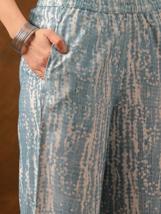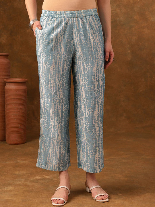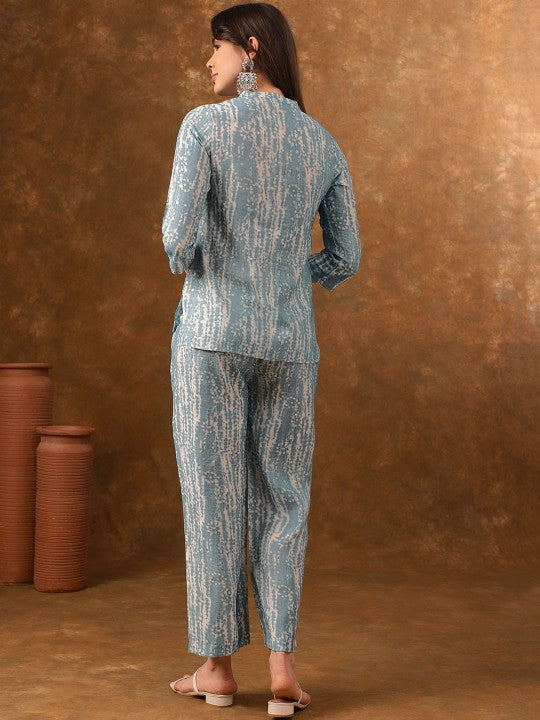 This set includes two items – one top and one pair of trousers – designed for casual occasions. The trousers are made of viscose rayon with a printed pattern, featuring a slip-on closure for comfort. The top, also crafted from viscose rayon with a printed design, comes with a mandarin collar and three-quarter sleeves, offering a stylish yet regular fit. Both pieces are sustainable, easy to wear, and best maintained with hand wash care.