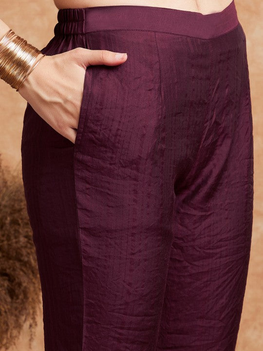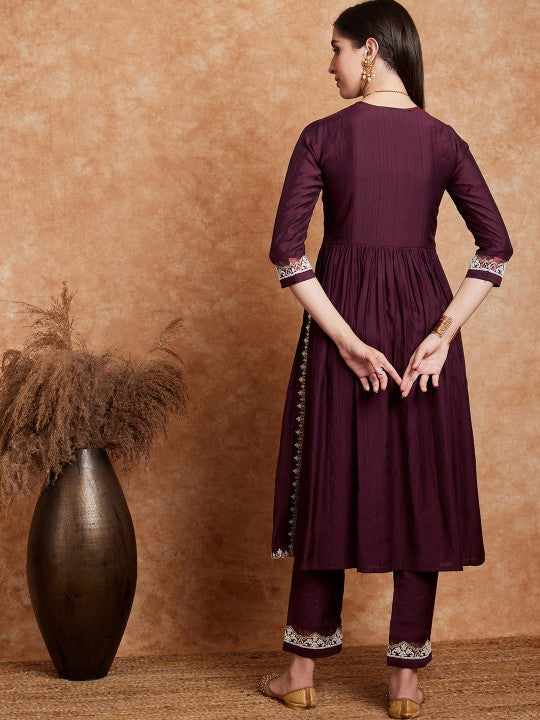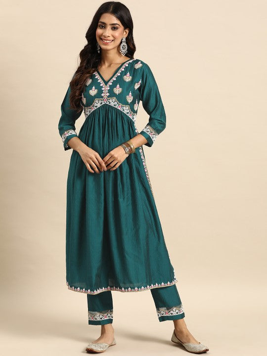 This ensemble features a stylish three-quarter sleeve kurta with an elegant A-line shape, designed to offer a flattering fit. The kurta, characterized by its calf-length and curved hemline, boasts intricate embroidered ethnic motifs, providing a festive and sophisticated look. The V-neck adds a touch of classic charm, while the regular design styling ensures comfort and versatility. The bottom piece, a pair of solid-colored trousers, complements the kurta perfectly with its slip-on closure and partially elasticated waistband for ease of wear. The outfit is further adorned with thread work ornamentation, adding to its festive appeal. Machine-woven with regular weave patterns, the kurta's design includes coverage on the yoke or border. This two-piece set is ideal for festive occasions, combining traditional aesthetics with contemporary comfort.