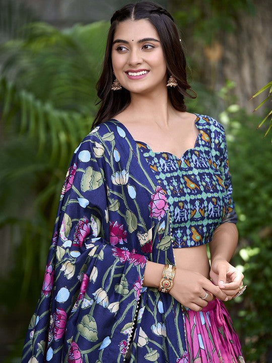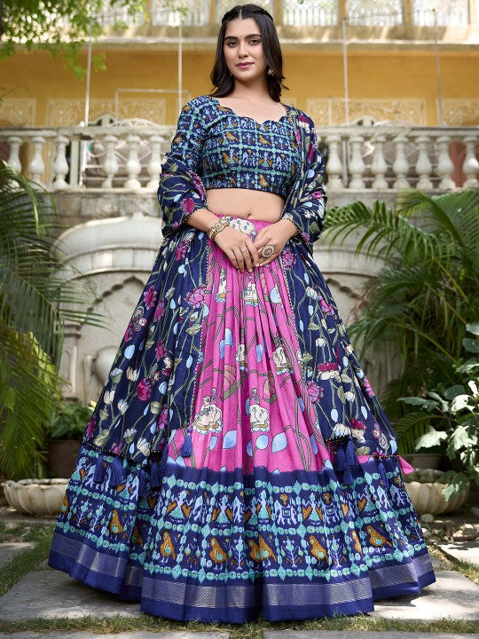 Elevate your ethnic wardrobe with this stunning Ethnic Motifs Printed Ready-to-Wear Lehenga Set. Designed to captivate, this ensemble features an elegant ready-to-wear lehenga with a flared hem, exuding grace and charm. The lehenga is paired with a beautifully printed dupatta adorned with tassel borders, adding a festive touch to the outfit.The set includes an unstitched blouse, offering customization options to suit your style. Designed with a sweetheart neckline and short sleeves, the blouse enhances the feminine appeal of the attire. Crafted from a rich silk blend for both the lehenga and blouse, and a silk dupatta, this outfit radiates luxury and sophistication. With a poly crepe lining for added comfort and structure, this lehenga set is perfect for weddings, festivals, and special occasions. To maintain its elegance and fabric quality, dry cleaning is recommended.
