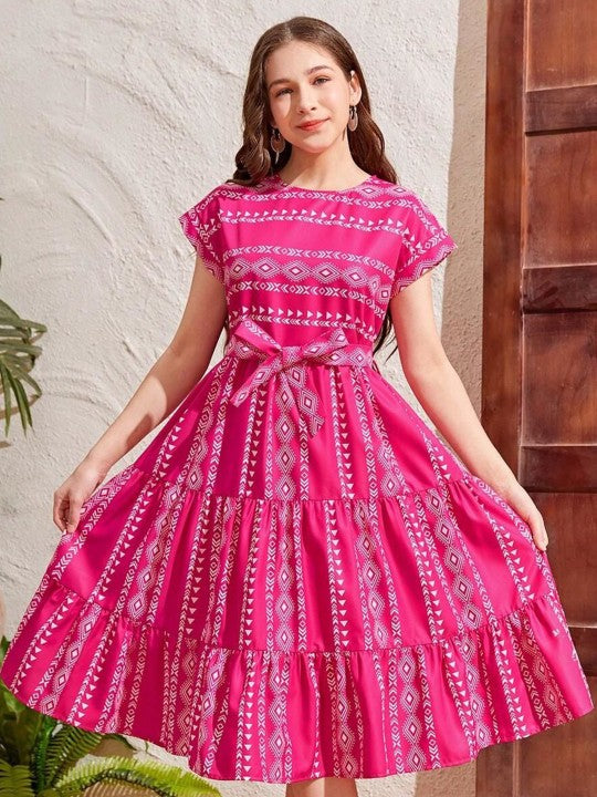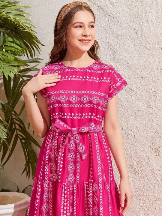 Floral Print Fit & Flare Cotton Midi Dress is a delightful and stylish option for both casual outings and special occasions. This pink floral print dress is designed in a flattering fit-and-flare silhouette, creating a charming and feminine look that complements all body types. It features a classic round neckline and short regular sleeves, striking a perfect balance between comfort and style. The midi-length dress ends in a graceful flared hem, adding a touch of elegance and movement to each step. Crafted from soft, breathable cotton fabric, it ensures all-day comfort. Accompanied by a coordinating belt, this dress allows for a cinched waist, enhancing its fit and adding a touch of sophistication. With its timeless floral print and easy-care fabric, this dress is a versatile addition to any wardrobe.