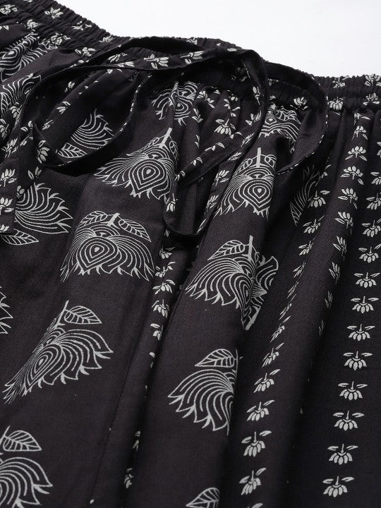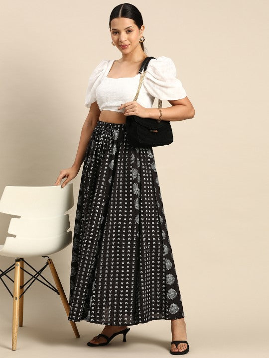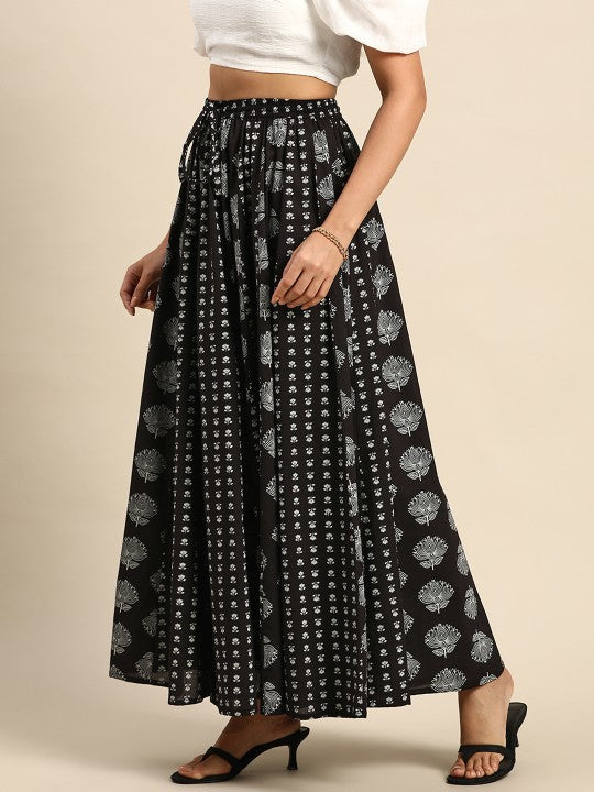 Floral Printed Flared Maxi Skirt in black is a captivating addition to any wardrobe, featuring an elegant floral print that stands out against the dark base. Made from woven fabric, this skirt offers a light and airy feel, perfect for achieving a graceful, feminine look. It is designed with a flared silhouette, creating a flowy and effortlessly chic aesthetic. The elasticated waistband with a drawstring closure allows for a customizable fit, adding comfort and convenience. The hemline is flared for added movement and grace. This semi-sheer skirt adds a hint of allure while maintaining sophistication. To ensure the fabric and print remain in top condition, hand washing is recommended.