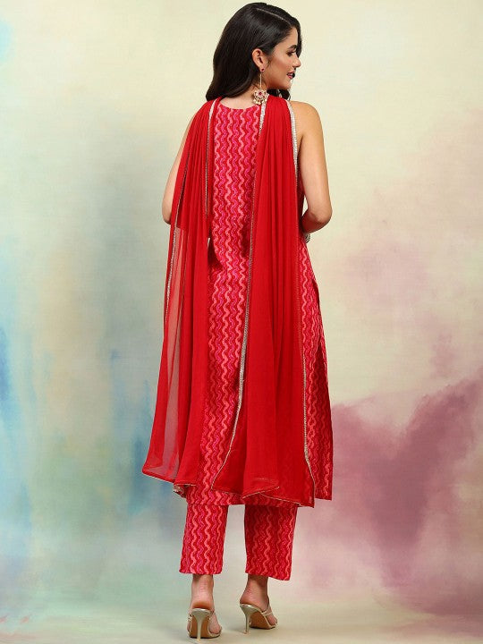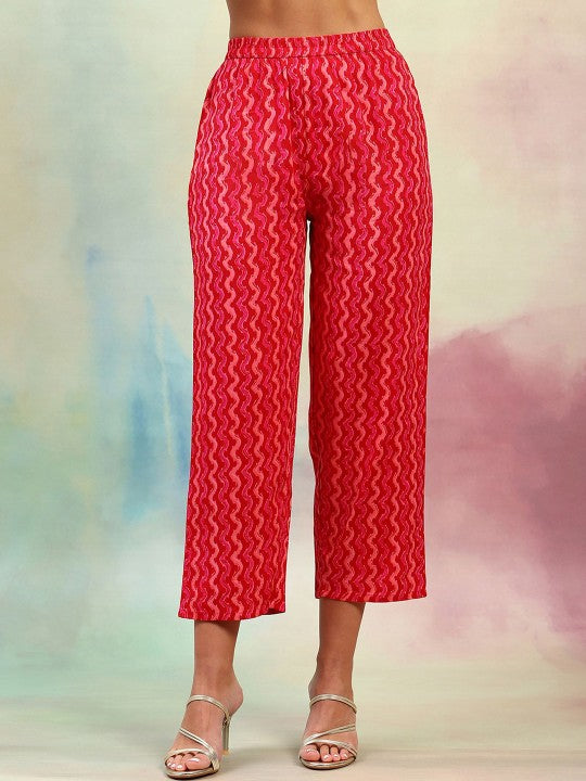 This festive set includes a straight-shaped, sleeveless kurta with a round neckline, printed in a geometric pattern, and styled with a straight hemline that reaches calf length. Paired with printed palazzos featuring an elasticated slip-on waistband for ease and comfort, the outfit offers a chic yet relaxed vibe. The dupatta is solid in color, accented with a taped border, adding a touch of simplicity to the look. Machine-woven with large pattern coverage, the set is perfect for festive occasions. The package contains three items: one kurta, one pair of palazzos, and one dupatta.