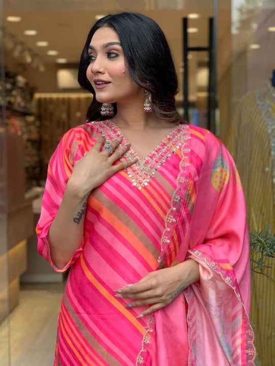 This ensemble features a straight-shaped kurta with three-quarter sleeves, a V-neckline, and a printed Leheriya pattern, styled in a regular design with a straight hemline that reaches calf length. The set includes solid-colored slip-on trousers with a partially elasticated waistband for comfort. A printed dupatta, adorned with taping along the border, completes the outfit. The entire look is ideal for festive occasions, showcasing a blend of machine-woven fabric with large pattern coverage and sequined ornamentation. This set comprises three items: the kurta, trousers, and dupatta.