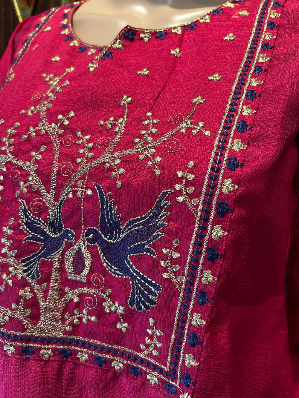 Step out in vibrant style with this stunning fuchsia pink kurti, a perfect statement piece for any special occasion. The highlight of this garment is its exquisitely embroidered yoke, which showcases a graceful bird motif surrounded by intricate floral vines. Rendered in a beautiful combination of shimmering gold, blue, and accent threads, the detailed embroidery adds a touch of opulence and artistry. This kurti is designed in a timeless straight-cut silhouette from a lustrous fabric that lends it an elegant sheen. Featuring a classic round neck and 3/4 length sleeves, it combines sophisticated style with all-day comfort. Pair this eye-catching tunic with gold palazzos, beige trousers, or a skirt for a polished and festive look.