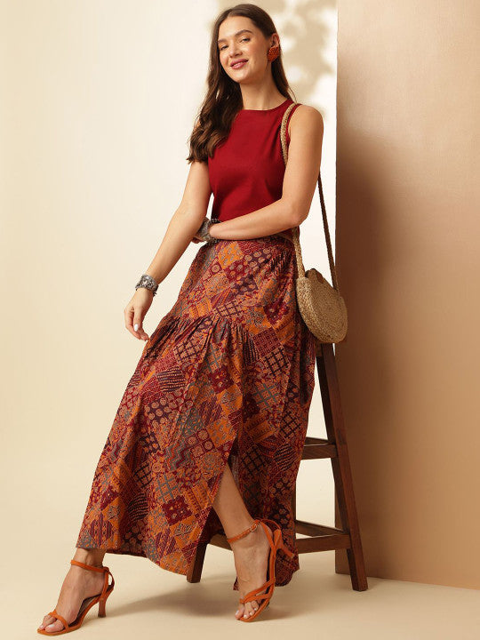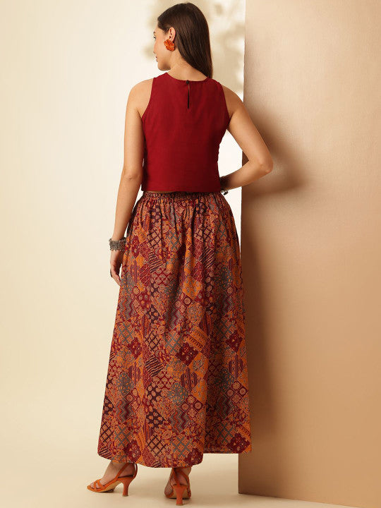 This casual outfit set includes two pieces, a top and a skirt, crafted for comfort and style. The skirt is made from pure cotton fabric with a printed pattern and features a convenient slip-on closure along with one pocket. Paired with it is a pure cotton top in a solid pattern, styled with a boat neck and sleeveless design. With a sustainable, regular fit and easy machine-wash care, this ready-to-wear set offers a simple yet chic look, perfect for casual occasions.