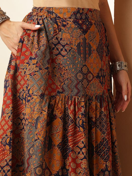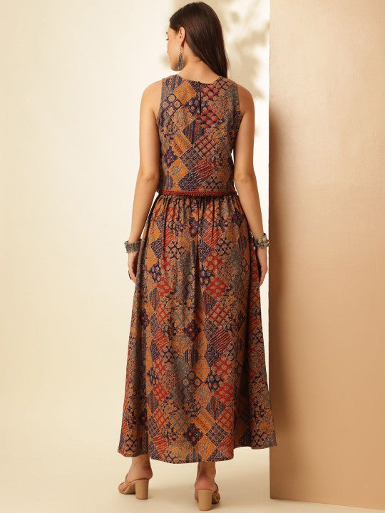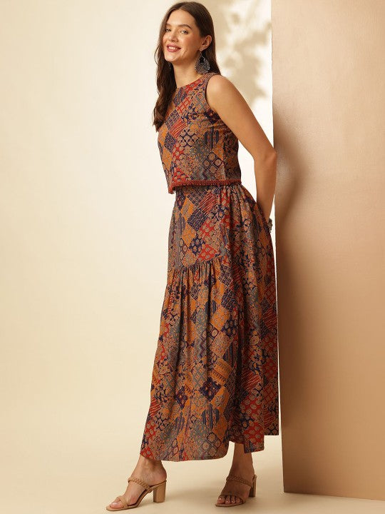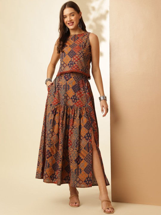 This stylish two-piece set includes one top and one skirt, perfect for casual occasions. The skirt is crafted from pure cotton with a printed pattern, designed with a slip-on closure and a single pocket for convenience. The top, also made from pure cotton, features a printed design with a boat neck, button closure, and a sleeveless style, enhanced by ruffles and flounces for a trendy touch. Both pieces offer a regular fit, are sustainable, and can be easily maintained with machine wash care.