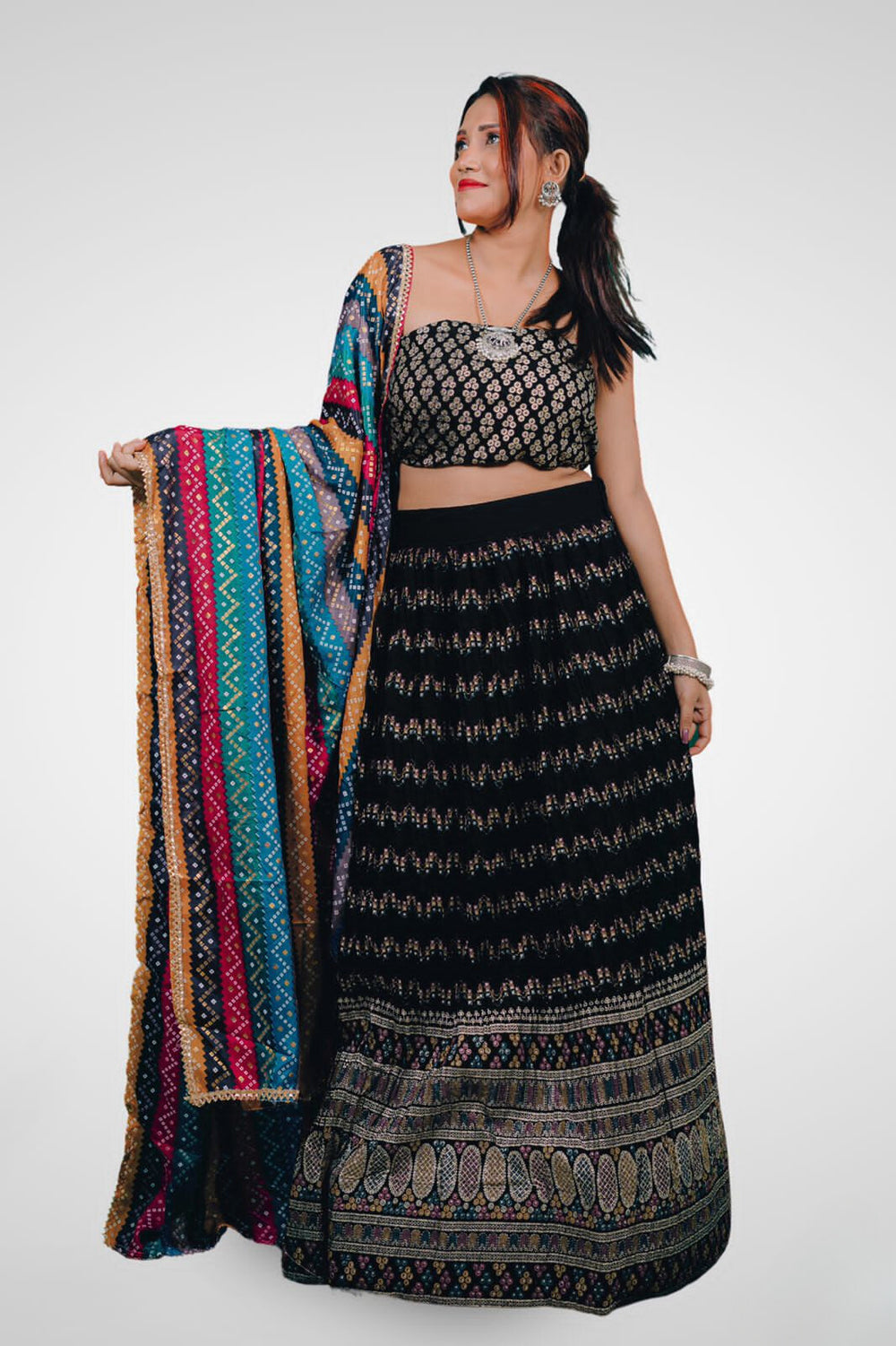 Elevate your festive wardrobe with our Multicolor Vibrant Semi-Stitched Lehenga Cholis, crafted from high-quality fabric that ensures comfort and elegance. Featuring intricate printed designs, this lehenga exudes charm and sophistication, making it perfect for weddings, parties, and festive celebrations.