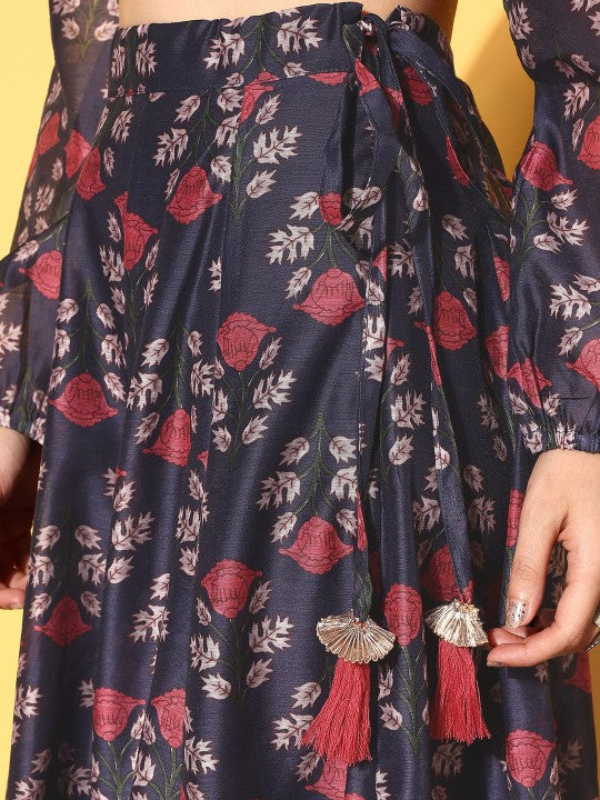 This stunning lehenga set features a flared hemline and is crafted from high-quality polyester fabric for both the lehenga and blouse, ensuring a beautiful drape and luxurious feel. The lehenga is lined with soft cotton fabric for added comfort and breathability. Designed for convenience, the lehenga has a slip-on closure, while the blouse secures with a zip. The V-neck blouse with long, puffed sleeves adds a touch of elegance and sophistication to the ensemble. Both the lehenga and choli are ready to wear, with a charming printed pattern that enhances their visual appeal. This set effortlessly combines traditional aesthetics with modern comfort.