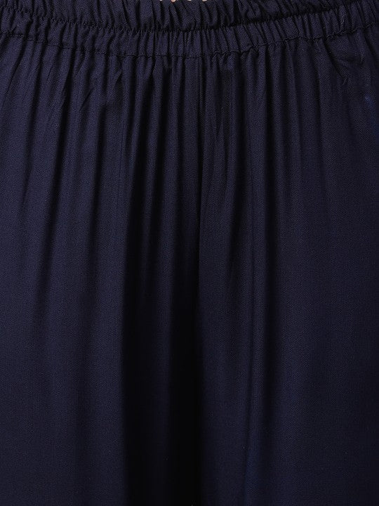 This festive ensemble features a three-quarter sleeve Anarkali kurta paired with palazzos and a dupatta. The kurta showcases a flared hemline and calf-length design, offering a graceful and flowing silhouette. Its round neck and empire design styling enhance the traditional aesthetic, while the printed abstract pattern and thread work ornamentation add a touch of modern sophistication. The palazzos, with a solid pattern and elasticated waistband, provide comfort and ease with a slip-on closure. The accompanying solid dupatta, adorned with taping on the border, completes the look. Machine-woven with a regular weave pattern, the kurta's design coverage is large, making a striking impression. This three-piece set, containing one kurta, one palazzo, and one dupatta, is perfect for festive occasions, blending traditional elegance with contemporary style.