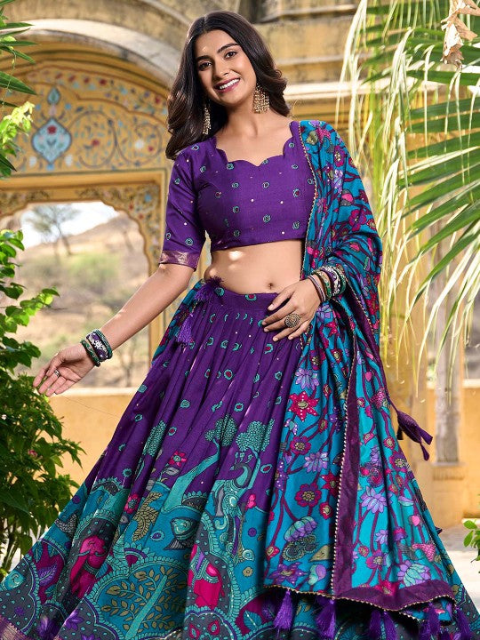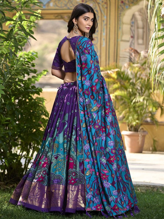 This exquisite Printed Kalamkari Ready-to-Wear Lehenga Set is a celebration of vibrant colors and traditional craftsmanship. Featuring an elegant combination of purple, blue, and green hues, this lehenga choli set is adorned with intricate Kalamkari prints, showcasing the timeless beauty of Indian textile art. The lehenga comes with a matching dupatta that complements the ensemble, adding grace and charm to the attire. The set also includes an unstitched blouse, designed with a round neck and short sleeves, providing the flexibility to customize the fit and style as desired. Further enhancing its appeal, the lehenga features delicate tassel borders that lend a playful and festive touch. Crafted from luxurious silk with a poly crepe lining, this ensemble ensures comfort and elegance. Ideal for special occasions, the lehenga requires dry cleaning to maintain its rich texture and vibrant colors.
