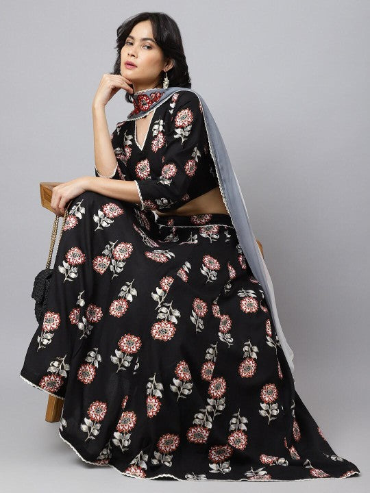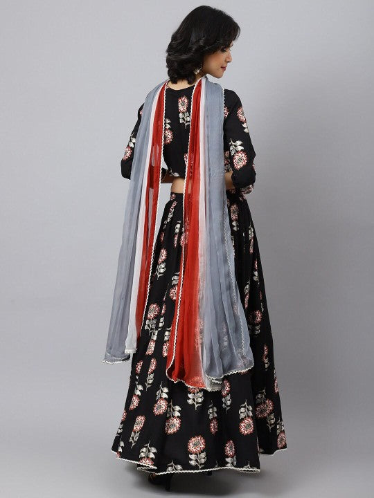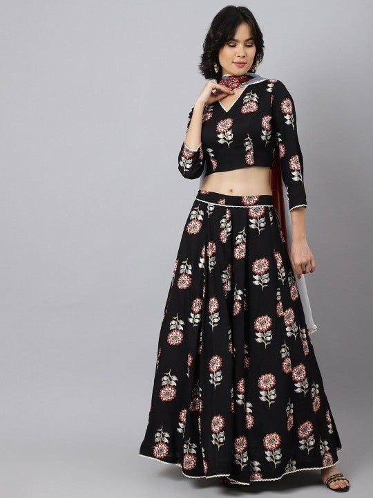 This stunning lehenga set features a beautifully flared lehenga and a matching blouse, both made from luxurious viscose rayon fabric. The lehenga includes a comfortable slip-on closure and a soft viscose rayon lining for added comfort. The V-neck blouse comes with regular three-quarter sleeves for a traditional yet stylish look. The set is complemented by a printed poly chiffon dupatta with elegant taping on the border, completing the ensemble with a graceful touch. Ready to wear and perfect for any occasion, this printed lehenga set ensures you look effortlessly chic and sophisticated.