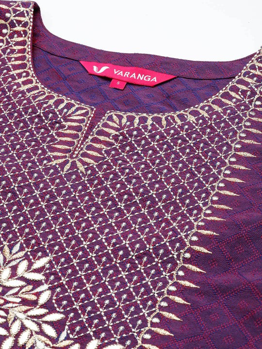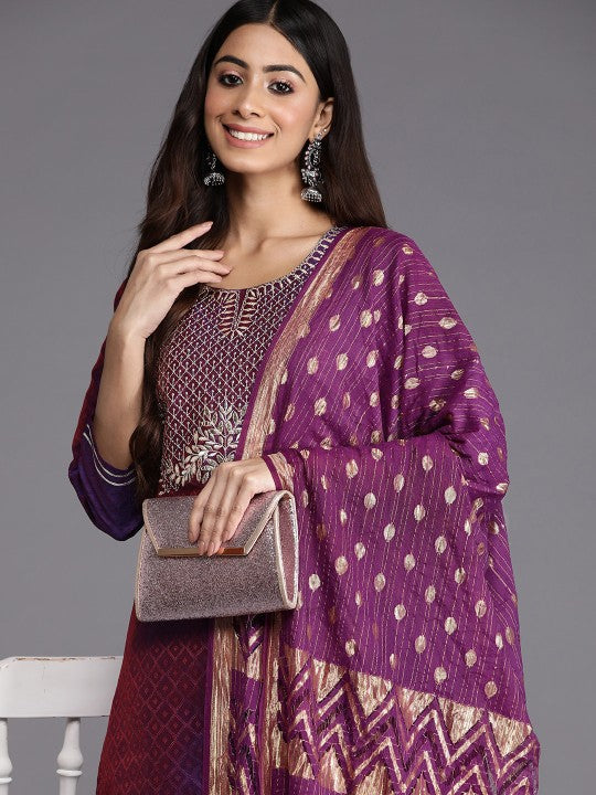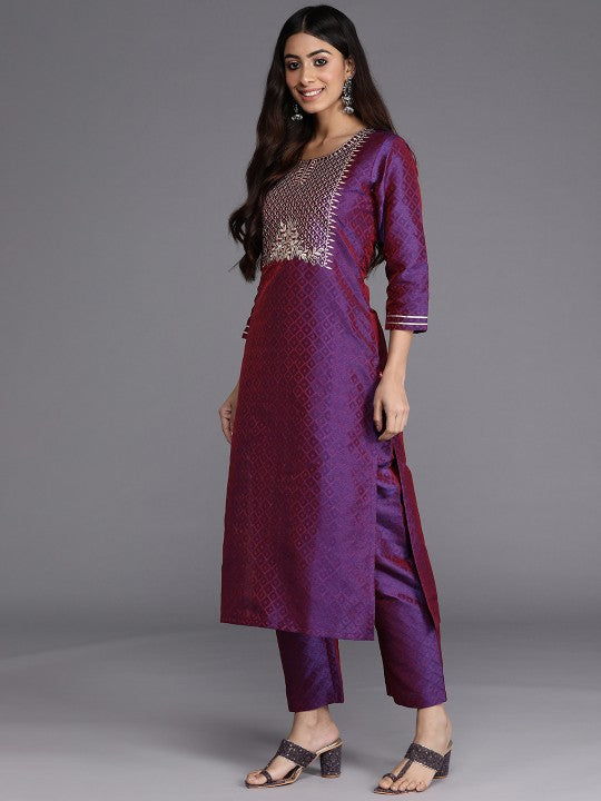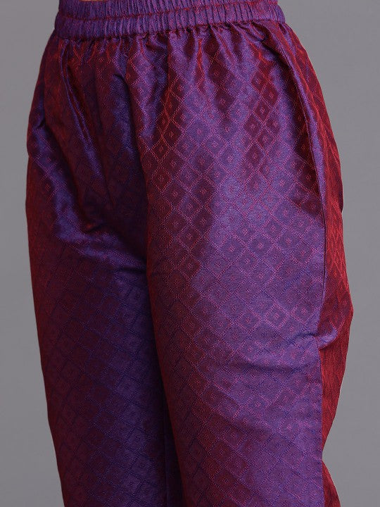 The Purple Geometric Woven Design Thread Work Jacquard Kurta with Trousers & Dupatta is a striking ethnic ensemble that effortlessly blends tradition with modern elegance. Featuring a floral woven design, this set showcases intricate craftsmanship, making it a perfect choice for festive and special occasions. Designed in a straight shape with a regular fit, the kurta offers a sophisticated silhouette that flatters all body types. The round neckline and three-quarter regular sleeves add to its classic appeal, while the thread work detailing enhances its richness and elegance. Falling to a calf-length with a straight hem, the kurta pairs seamlessly with printed trousers for a chic and coordinated look. Made from a silk blend machine-woven fabric, both the top and bottom provide a luxurious feel and a subtle sheen, adding to the outfit’s regal charm. The trousers feature an elasticated waistband and a slip-on closure, ensuring ease of wear and comfort. The set is completed with a super net dupatta, which adds a delicate and airy finishing touch. For maintaining its intricate detailing and fabric quality, dry cleaning is recommended. Whether for festive gatherings or celebratory events, this elegant kurta set is a timeless addition to any ethnic wardrobe.