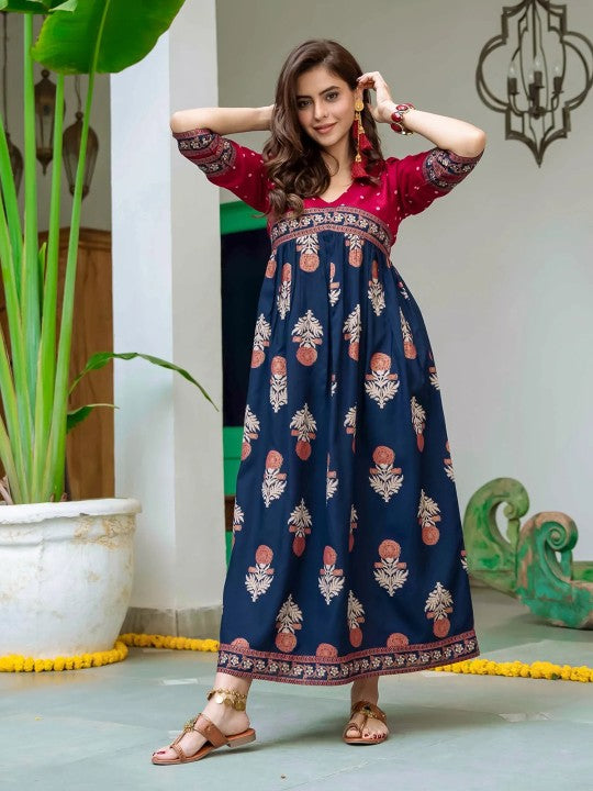 The Red & Navy Blue Ethnic Motifs Printed Maxi Dress is a stunning blend of traditional charm and modern elegance. Designed with intricate ethnic motifs, this dress features a vibrant red and navy blue color palette that adds a touch of sophistication to your wardrobe. Crafted from Liva Viscose Rayon, the fabric ensures a soft, breathable, and flowy drape, offering unmatched comfort and grace. The woven texture enhances durability, making it a perfect choice for both casual and festive occasions. The flared silhouette of the dress provides a flattering fit, allowing for effortless movement while maintaining a graceful appeal. The V-neckline adds a touch of femininity, beautifully complementing the three-quarter sleeves, which strike a balance between style and coverage. Adorned with timeless ethnic prints, this maxi dress is a perfect blend of culture and fashion. Whether paired with statement accessories or worn on its own, it is sure to make heads turn. Designed for convenience, it is machine washable, making maintenance hassle-free.
