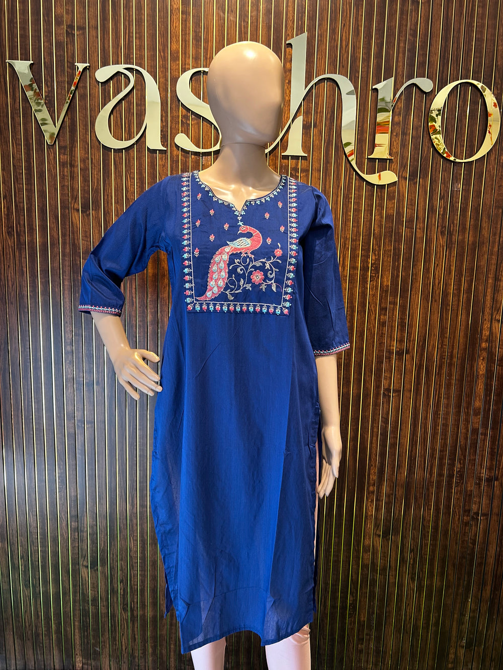 Add a touch of elegance to your ethnic wardrobe with this Royal Blue Peacock Embroidered Kurta. Crafted from soft, breathable fabric, this kurta features exquisite embroidery on the front, highlighted by a stunning peacock motif and delicate floral detailing. The three-quarter sleeves and notched neckline add a refined finish, while the straight-cut silhouette ensures a comfortable yet flattering fit. Perfect for casual outings or festive occasions, this piece pairs beautifully with leggings, palazzos, or churidars for a graceful, timeless look.