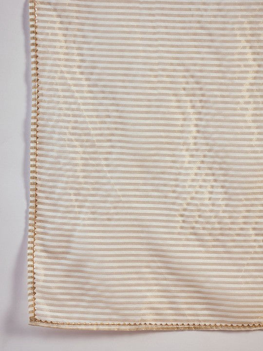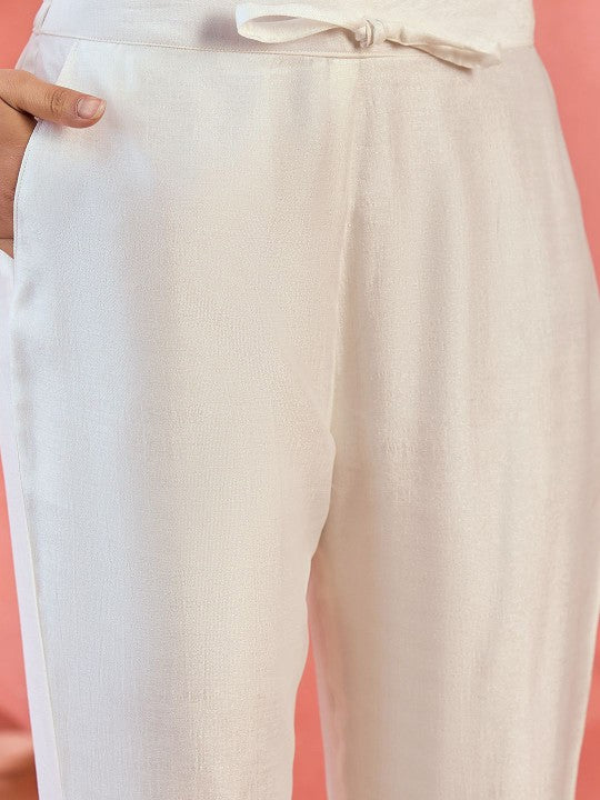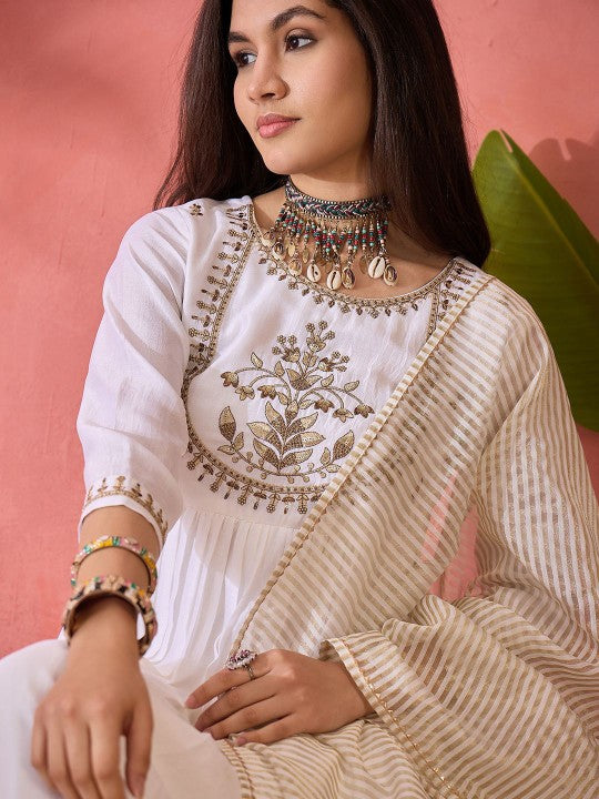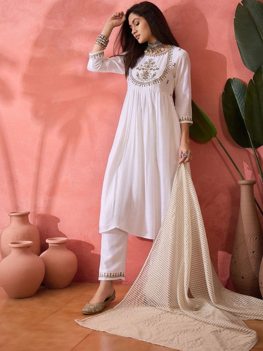 This three-piece set includes a kurta, trousers, and a dupatta, offering a stylish and elegant ensemble. The kurta features three-quarter sleeves, an A-line shape, and a flared hemline, with a calf-length silhouette and a round neck. It is adorned with embroidered detailing and sequinned ornamentation, adding a touch of festive charm. The design styling is kept regular for a balanced look. The trousers have a slip-on closure with a partially elasticated waistband and feature matching embroidered patterns for a cohesive finish. The set is completed with an embroidered dupatta featuring a taping border. Crafted using a regular machine weave pattern, the outfit showcases intricate embroidery concentrated on the yoke or border area, making it ideal for both special occasions and traditional wear.