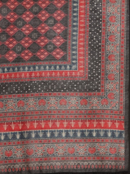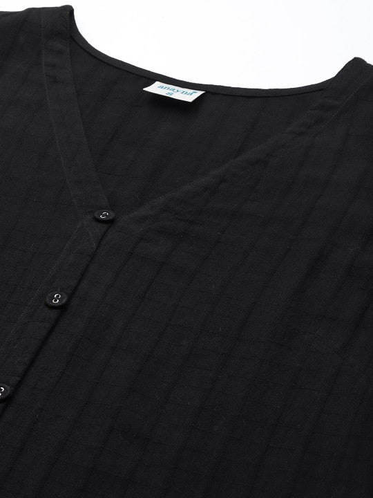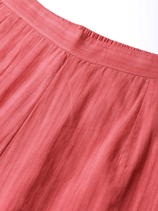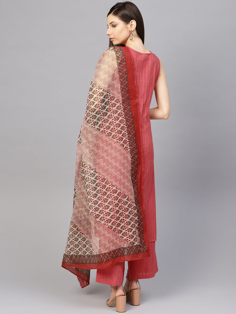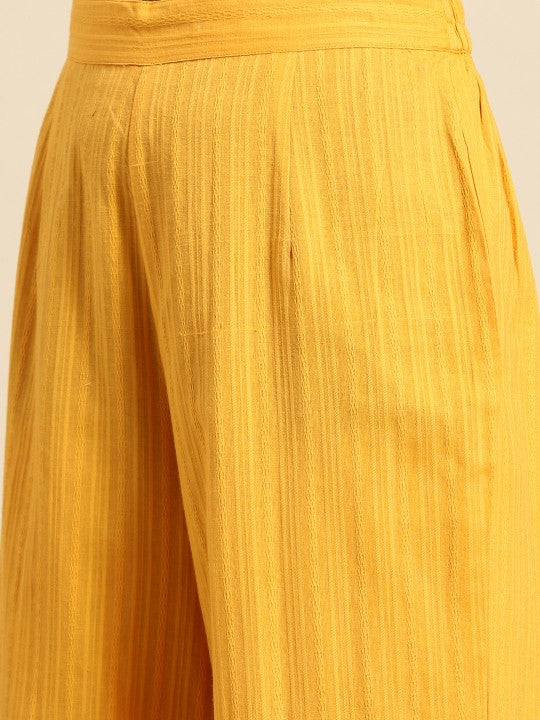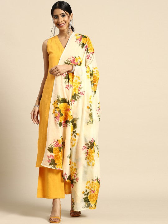 This stylish kurta set features a sleeveless, straight-cut kurta with a V-neck and a solid pattern that extends to a calf-length hemline. It comes with matching slip-on palazzos that have a partially elasticated waistband for added comfort. The ensemble is complemented by a beautifully printed dupatta with a solid border, adding an ethnic motif touch to the overall look. Perfect for fusion wear, the kurta and palazzos showcase a regular weave pattern created by machine weave, ensuring durability and elegance.