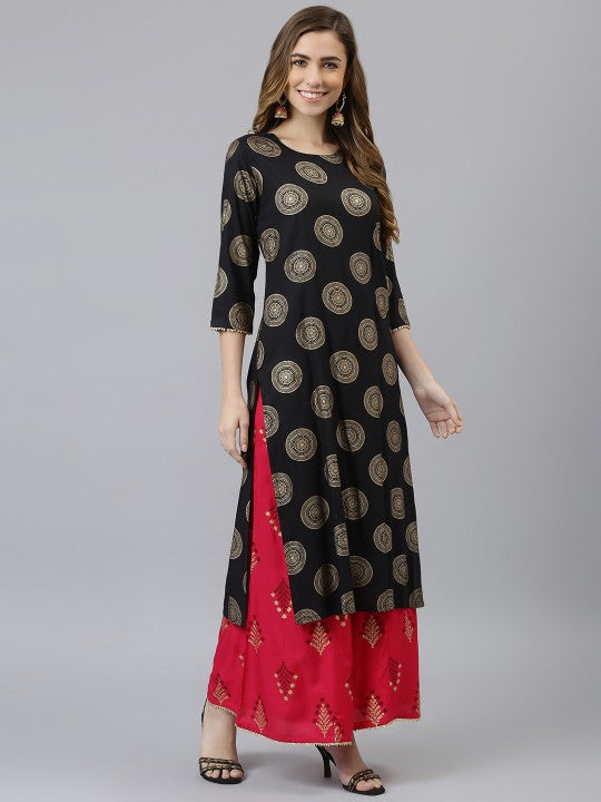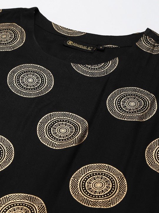 The Women’s Black and Gold-Toned Printed Kurta with Palazzos is a stylish ensemble perfect for festive occasions. The kurta features a sophisticated round neck design and three-quarter sleeves, offering both comfort and elegance. Its straight hem and side slits provide a modern touch, ensuring ease of movement and a flattering silhouette. Crafted from high-quality viscose rayon, the kurta and palazzos showcase the beauty of handloom weave, adding a hint of traditional charm. The partially elasticated waistband of the palazzos ensures a secure yet comfortable fit, while the slip-on closure enhances convenience. The black and gold-toned print makes this outfit a standout choice for festive celebrations. To maintain its rich texture and longevity, this attire is best cared for with dry cleaning. A blend of comfort, elegance, and tradition, this set is ideal for creating a graceful festive look.