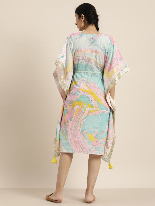 This ready-to-wear kaftan dress is crafted from soft cotton fabric with a woven finish, offering both comfort and durability. Designed in line with abstract fashion trends, it features an eye-catching printed abstract pattern. The flared midi-length silhouette is complemented by a flattering V-neck and three-quarter kimono sleeves, adding a touch of elegance. Tie-up detailing enhances its surface styling, while its opaque construction ensures modesty. Perfect for daily wear, this dress combines style and ease, with the added benefit of simple hand wash care.