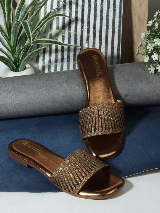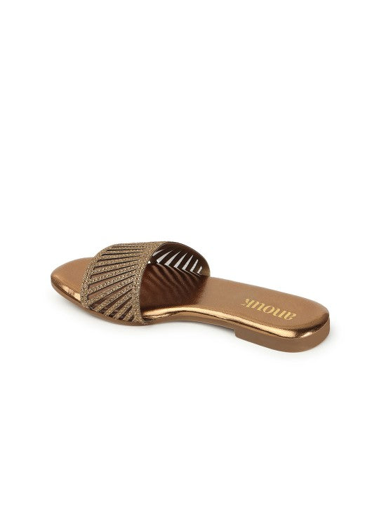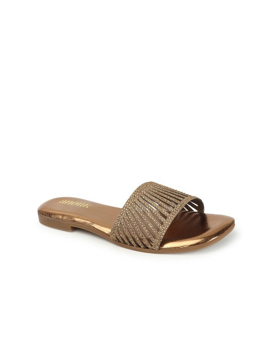 These open-toe flats feature a stylish and contemporary design, making them perfect for parties and special occasions. With an open-toe shape and no back strap, they offer a comfortable and easy slip-on style. The embellished pattern adds a touch of elegance, while the Western-inspired ornamentation enhances their fashionable appeal. Designed with a regular ankle height and crafted from synthetic sole material, these flats combine durability with modern aesthetics, ensuring both comfort and style for any event.