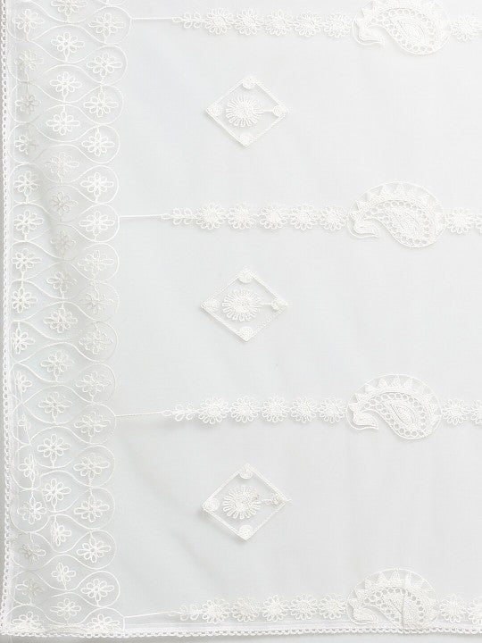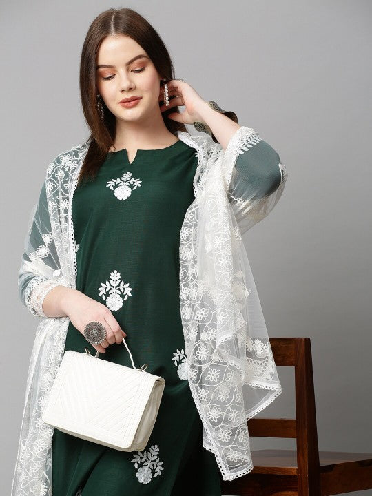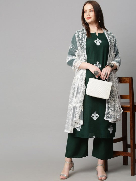 This elegant festive kurta set features a straight-cut kurta with three-quarter sleeves, a round neckline, and a calf-length, straight hemline. The kurta is adorned with intricate ethnic motif embroidery and thread work, adding a touch of sophistication to the regular design styling. Paired with solid palazzos that have an elasticated waistband and a slip-on closure, this ensemble ensures comfort and ease of wear. The set is completed with an embroidered dupatta featuring a taping border, enhancing the overall elegance. Crafted with a regular weave pattern and machine weave type, this outfit is perfect for festive occasions, combining traditional charm with contemporary style.