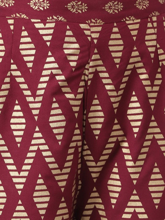 This elegant ensemble features a women's maroon solid kurta with trousers and a dupatta, perfect for a refined ethnic look. The maroon straight calf-length kurta comes with a stylish mandarin collar, three-quarter sleeves, and multiple slits for ease of movement and added flair. Complementing the kurta are maroon printed trousers with a partially elasticated waistband and a convenient slip-on closure, designed for both comfort and style. The trousers also feature a beautifully printed border, adding a subtle decorative touch. Crafted from viscose rayon, this outfit ensures both breathability and comfort. The set is easy to maintain with a simple hand-wash care routine, making it a practical and graceful choice for various occasions.